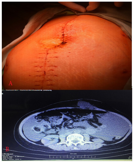 (A) Abdomen just before relaparotomy; (B) computed tomography showed postoperative ileus and elevated amount of free fluid.