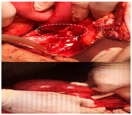 (A) Adhesion between terminal ileum and abdominal aorta causing obstructive ileus; MR—mesentery, TI—terminal ileum, AA—abdominal aorta; (B) dilatated caecum.