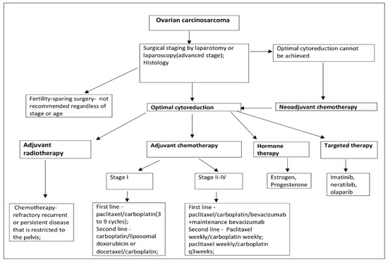 Currently, the National Comprehensive Cancer Network (NCCN) guidelines recommend that paclitaxel 175 mg/m2/carboplatin (three to nine cycles) is the preferred adjuvant chemotherapy regimen for OCS stage I. Other recommended regimens are carboplatin/liposomal doxorubicin or docetaxel/carboplatin. In certain circumstances carboplatin/ifosfamide, cisplatin/ifosfamide, and paclitaxel/ifosfamide might be used [34]. In stage II–IV, paclitaxel/carboplatin/bevacizumab + maintenance bevacizumab, are added as first-line treatment. Paclitaxel weekly/carboplatin weekly and paclitaxel weekly/carboplatin q 3 weeks are additional second-line treatment regimens. NCCN stated that data on primary systemic therapy regimes for OCS are limited [34].