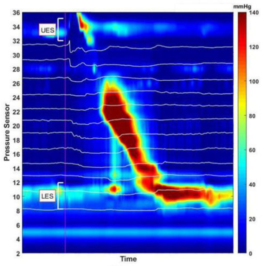 Assessment of successful esophageal emptying using high-resolution impedance manometry (HRIM) monitoring. Data from pressure sensors on the HRIM catheter are displayed on the y-axis and the time is displayed on the x-axis. The graph indicates the esophageal pressure topography, from the pharynx to the stomach, showing two high-pressure zones. The upper high-pressure zone is the upper esophagus sphincter (UES), while the lower zone is the lower esophageal sphincter (LES). The impedance of the 12 sequential channels from the esophagus into the stomach is represented as 12 white horizontal lines. Effective esophageal contraction relies on bolus transmission, during which the level of impedance decreases.