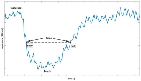 Successful bolus transmission from the UES, esophagus, and LES into the stomach is shown in Figure 1. Transmission through the portion of the esophagus was determined as the impedance-measuring segment of the time interval between bolus entry (50% decrease from baseline relative to nadir) and bolus exit (recovery of 50% of baseline; Figure 2) [33].