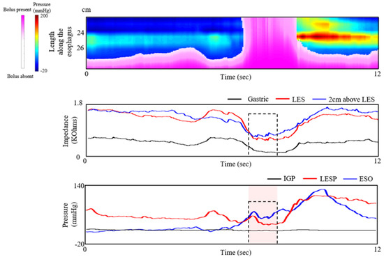 Successful BT through the LES was defined as both bolus presence and a flow-permissive pressure gradient. The onset of bolus presence was defined as the drop in impedance to 90% of the nadir, while bolus passage was defined as a return of impedance to 50% of the baseline. A pressure gradient was considered permissive when the esophageal pressure was higher than both the LES and the intra-gastric pressure signals (Figure 3) [16,34,35].