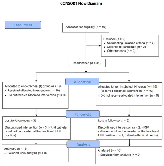Because of the limited data about the time required to regain effective postoperative esophageal and oropharyngeal emptying after emergence, we took the postoperative complication incidence from previous studies of intubated and non-intubated VATS as the references to calculate the required sample size. To estimate the complications for the non-intubated group, we used data from our non-intubated VATS data set, which spanned seven years. These data were published in 2019 by Hung et al. [36]. To estimate the complications for the intubated group, we used the study by Russo et al. as a reference [37]. Therefore, these values were set at 0% in the N group, referencing Hung et al., and at 50% in the I group, referencing Russo et al. [36,37]. Using MedCalc statistical software version 18.10.2 (MedCalc Software, Ostend, Belgium), we estimated that a sample size of 15 patients per group would provide 80% power with an alpha level of 0.05. We therefore decided to enroll 15 patients per group. After we started this study and assessed the first eight patients, we reconfirmed this sample size calculation.