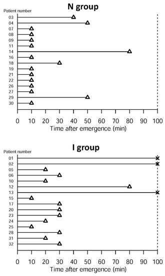 Time to successful esophageal emptying after emergence for both groups. Time to the first presentation of successful bolus transmission (BT) through the lower esophageal sphincter based on individual high-resolution impedance manometry (HRIM) measurements. N: non-intubated video-assisted thoracoscopic surgery group; I: intubated video-assisted thoracoscopic surgery group. Measurement: HRIM was performed every 10 min, up to 10 times for each patient. Note: Δ: the first successful BT; ╳: the patient presented no successful BT within 10 measurements.