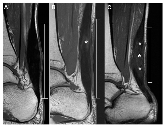 Figure 2. Postoperative appearance of the thickened Achilles tendon on the T1-weighted sagittal image. Thickened portion of the tendon is indicated as the interval between the normal portions of the tendon. Each image is representative subject classified into 3 categories: (A) Diffusely thickened with an isointense signal, (B) diffusely thickened with a focal hyperintense signal (asterisk), and (C) focally thickened into a fusiform appearance with a diffuse hyperintense signal (asterisks).