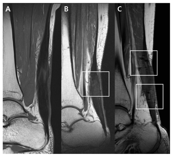Figure 3. Presence of remaining stitches within the tendon on the T1-weighted sagittal image through observation of the dark signal intensity artifact (within the boxes). Each image is representative subject classified into 3 categories: None (A), mild (B), and marked (C).