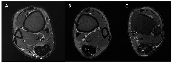 Figure 4. Postoperative changes of the tendon on the fat-saturated T2 weighted axial image. Each image is representative subject classified into 3 categories. Shape of the musculotendinous junction: Convex (A), flat (B), and concave (C). Signal changes around the tendon upon their location: Circumferentially surrounding the tendon (A, arrowheads), focally within the tendon (B, arrows), and diffusely throughout the tendon (C, asterisk).
