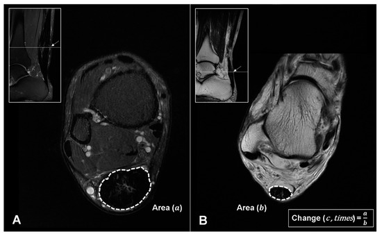 Figure 5. (A) Postoperative cross-sectional area (cm2) of the repaired tendon (a) measured at the thickest portion of the tendon (arrow) near the rupture site. (B) Preoperative cross-sectional area (cm2) of the ruptured tendon (b) measured at the thickest portion of the tendon (arrow) near the rupture site. Postoperative changes (c) were then compared by diving the two measured parameters (c = a/b).