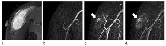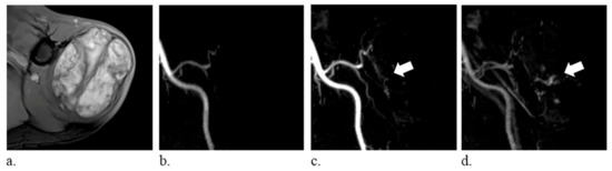 A 74-year-old man with hemangioma of the left shoulder. (a) fat-suppressed T2-weighted axial images (repetition time/echo time, 6060/62 ms) show a heterogeneously hyperintense mass. (b–d) time-resolved magnetic resonance angiography in the coronal plane demonstrates persistent vascular pooling within the lesion (arrows).
