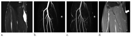 A 59-year-old man with a synovial cyst of the right leg. (a) fat-suppressed T2-weighted coronal images (repetition time/echo time, 6780/74 ms) show a homogeneously hyperintense mass. (b–c) the lesion, indicated with an *, is not discernible on the coronal images of time-resolved magnetic resonance angiography and therefore defined as occult lesion. (d) static-enhanced T1-weighted coronal images (500/9.1 ms) with fat suppression reveal absence of internal enhancement of the lesion (arrow).