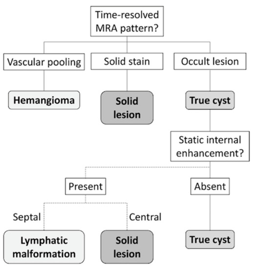 We developed a diagnostic flowchart based on time-resolved MRA patterns. The accurate differentiation between hemangiomas and solid lesions by using this approach is valuable in clinical practice. Because differentiating cyst-like soft-tissue masses through imaging may be challenging, a histopathology analysis through biopsy is often required for a definite diagnosis. However, biopsy of a hemangioma is associated with the risk of hemorrhage and low diagnostic yield [6]. Using this flowchart, hemangiomas can be confidently differentiated from solid lesions to avoid unnecessary and potentially risky biopsy. A systemic review by Kim et al. also highlighted the use of time-resolved MRA to facilitate diagnosis of vascular lesions in pediatric patients [24].