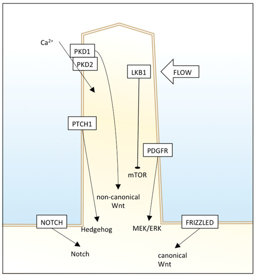 The primary cilium has different signaling receptors on the ciliary membrane, including those for Hedgehog (Hh), Notch, mTOR, platelet-derived growth factor receptor (PDGFR), and canonical and non-canonical Wnt pathways (Figure 1).
