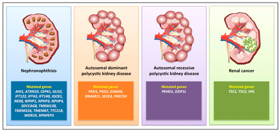 NPHP has been correlated with mutations in at least 25 different genes (Figure 2) involved in renal development and homeostasis [40].