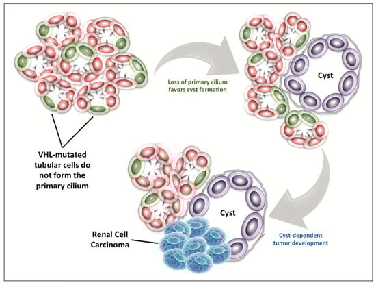 VHL loss in renal carcinogenesis. VHL-mutated tubular cells have been shown to not form the primary cilium. This event favors cyst formation and can lead to the development of renal cell carcinoma.