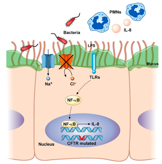 Airway inflammation in cystic fibrosis. Mutations in CFTR lead to imbalances in fluid and electrolyte homeostasis characterized by the lack of transport of chloride (Cl−) and excessive sodium (Na+) reabsorption. This impairs mucociliary clearance and increases the viscosity of the mucus, thus promoting chronic bacterial colonization (i.e., by Staphylococcus aureus and Pseudomonas aeruginosa). The resultant shedding of microbial molecules, known as pathogen-associated molecular patterns (PAMPs) (i.e., lipopolysaccharide, LPS), being recognized by the Toll-like receptors (TLRs), constitutively activates the NF-κB and causes the consequent production of inflammatory cytokines (i.e., IL-8), as well as the accumulation of polymorphonuclear neutrophils (PMNs) into the airways. CFTR, cystic fibrosis transmembrane conductance regulator; IL-8, interleukin-8; LPS, lipopolysaccharide; NF-κB, nuclear factor κ light-chain enhancer of activated B cells; PMNs, polymorphonuclear neutrophils; TLRs, toll-like receptors.