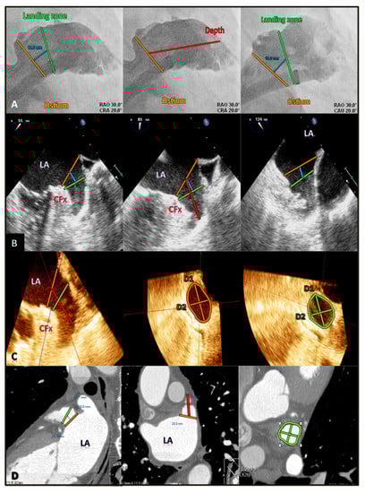 Standard measurements of LAA by different imaging modalities. (A) Selective angiography measurements at the echocardiographic ostium (orange line), landing zone (green line) at 10 mm (blue line) from ostium, and LAA depth (red line). (B) 2D TOE measurements of the ostium, landing zone, and depth. (C) 3D TOE standard measurements of ostium diameters and area, of landing zone diameters and area, and of LAA depth. (D) CCT multiplanar reconstruction images with measurements of the landing zone area, maximum and minimum diameter, and LAA depth. LA = left atrium; CFx = circumflex artery; D1 = maximum diameter; D2 = minimum diameter.