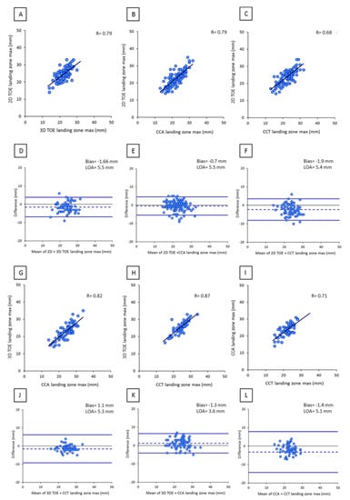 Correlation and agreement between landing zone measurements obtained by 2D TOE, 3D TOE, CCA, and CCT: (A) scatter plot of 2D TOE versus 3D TOE measurements, (B) scatter plot of 2D TOE versus CCA, (C) scatter plot of 2D TOE versus CCT, (D) Bland-Altman plot of 2D TOE versus 3D TOE, (E) Bland-Altman plot of 2D TOE versus CCA, (F) Bland-Altman plot of 2D TOE versus CCT, (G) scatter plot of 3D TOE versus CCA measurements, (H) scatter plot of 3D TOE versus CCT measurements, (I) scatter plot of CCA versus CCT measurements. (J) Bland-Altman plot of 3D TOE versus CCA measurements, (K) Bland-Altman plot of 3D TOE versus CCT, and (L) Bland-Altman plot of CCA versus CCT.