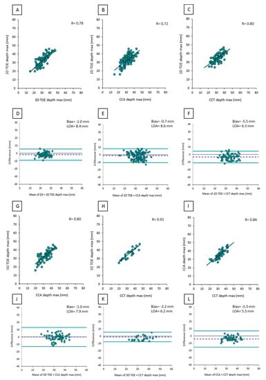 Correlation and agreement between LAA depth measurements obtained by 2D TOE, 3D TOE, CCA, and CCT: (A) scatter plot of 2D TOE versus 3D TOE measurements, (B) scatter plot of 2D TOE versus CCA, (C) scatter plot of 2D TOE versus CCT, (D) Bland-Altman plot of 2D TOE versus 3D TOE, (E) Bland-Altman plot of 2D TOE versus CCA, (F) Bland-Altman plot of 2D TOE versus CCT, (G) scatter plot of 3D TOE versus CCA measurements, (H) scatter plot of 3D TOE versus CCT measurements, (I) scatter plot of CCA versus CCT measurements, (J) Bland-Altman plot of 3D TOE versus CCA measurements, (K) Bland-Altman plot of 3D TOE versus CCT, and (L) Bland-Altman plot of CCA versus CCT.
