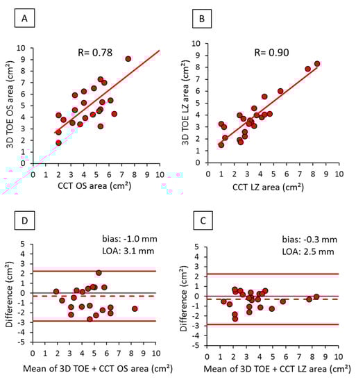 Concerning OS and LZ areas obtained by 3D TOE and CCT, we observed a good correlation between the two modalities: R = 0.78 (p < 0.001) for OS and R = 0.90 (p < 0.001) for LZ area. Furthermore, the LZ area measurements were characterized by very low discrepancy and narrow limits of agreement (Figure 4).