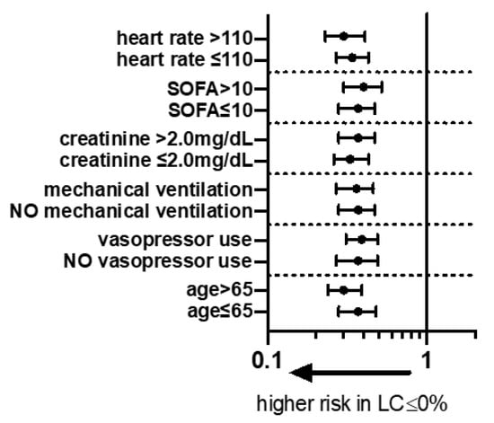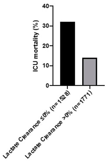 - Ha, T.S.; Shin, T.G.; Jo, I.J.; Hwang, S.Y.; Chung, C.R.; Suh, G.Y.; Jeon, K. Lactate clearance and mortality in septic patients with hepatic dysfunction. Am. J. Emerg. Med. 2016, 34, 1011–1015. [Google Scholar] [CrossRef] [PubMed]