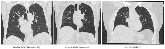 - Gordic, S.; Morsbach, F.; Schmidt, B.; Allmendinger, T.; Flohr, T.; Husarik, D.; Baumueller, S.; Raupach, R.; Stolzmann, P.; Leschka, S.; et al. Ultralow-dose chest computed tomography for pulmonary nodule detection: First performance evaluation of single energy scanning with spectral shaping. Investig. Radiol. 2014, 49, 465–473. [Google Scholar] [CrossRef]