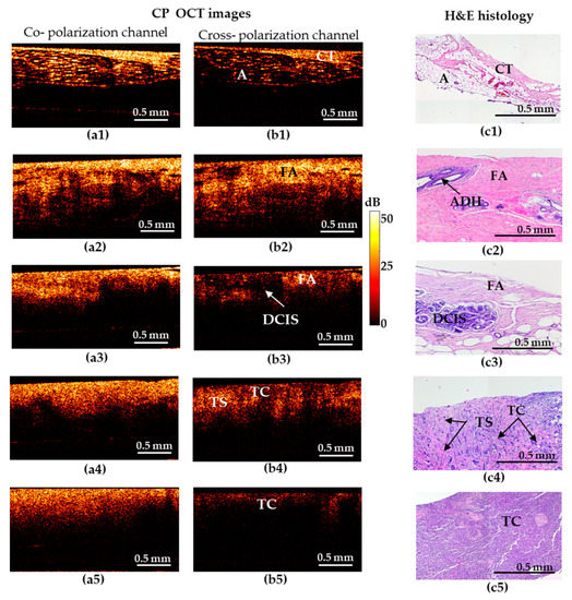 - South, F.A.; Chaney, E.J.; Marjanovic, M.; Adie, S.G.; Boppart, S.A. Differentiation of ex vivo human breast tissue using polarization-sensitive optical coherence tomography. Biomed. Opt. Express 2014, 5, 3417–3426. [Google Scholar] [CrossRef]