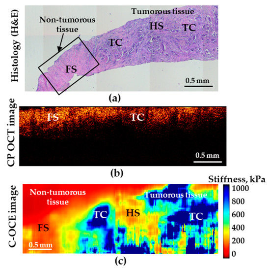 - Plekhanov, A.A.; Sirotkina, M.A.; Sovetsky, A.A.; Gubarkova, E.V.; Kuznetsov, S.S.; Matveyev, A.L.; Matveev, L.A.; Zagaynova, E.V.; Gladkova, N.D.; Zaitsev, V.Y. Histological validation of in vivo assessment of cancer tissue inhomogeneity and automated morphological segmentation enabled by Optical Coherence Elastography. Sci. Rep. 2020, 10, 11781. [Google Scholar] [CrossRef]