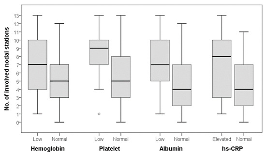 Number of involved nodal stations according to laboratory findings. There was no statistically significant difference for hemoglobin, but significant differences were observed for platelet, albumin, and high-sensitivity C-reactive protein (hs-CRP) levels (Mann-Whitney U test; hemoglobin, p = 0.186; platelet, p = 0.032; albumin, p = 0.027; hs-CRP, p = 0.025).