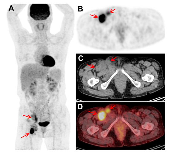 Treatment naïve FDG PET/CT images of a male with plasma cell subtype of multicentric CD (MCD). Maximum intensity projection PET (A) and trans-axial PET, CT, and fused PET/CT images (B–D) show intense FDG uptake in enlarged right external iliac and inguinal nodes (arrows; SUVmax 10.2 and T/L ratio 4.9). The FDG uptake intensity is high, but only two nodal stations were involved. The hemoglobin, platelet, albumin, and hs-CRP levels were within normal range. The patient received chemotherapy and siltuximab. Four years after the PET/CT study, the patient currently remains symptom free.