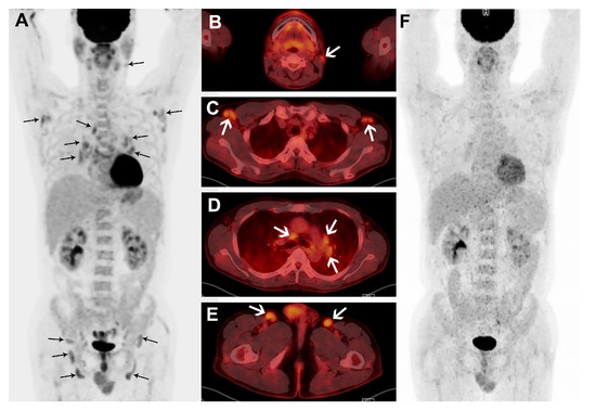 A male patient with plasma cell subtype of MCD confirmed by biopsy of right inguinal node. Maximum intensity projection (A) and transaxial fusion images (B–E) of treatment naïve FDG PET/CT show multiple, mildly enlarged LNs with mildly increased FDG uptake in bilateral cervical, axillary, mediastinal, bilateral hilar, perigastric, bilateral iliac, and inguinal areas (black and white arrows). The patient’s hemoglobin and albumin levels were low, while the hs-CRP level was high. In the FDG PET/CT performed to monitor the response to six cycles of chemotherapy, the nodal FDG uptakes are resolved in the maximum intensity projection image (F).