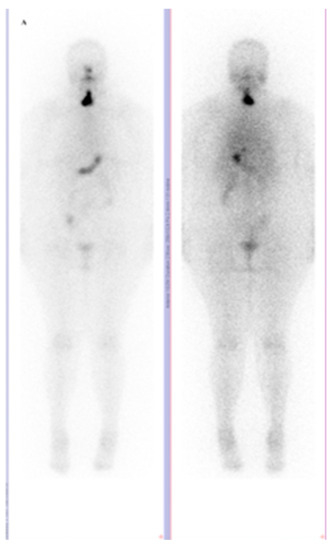 Whole Body Scan with I-131 sodium iodide (I-131 WBS) with 42,36 mCi (1,56 GBq) at 48 h postadministration, with thyroid remnant uptake (anterior left, posterior right) (2010).