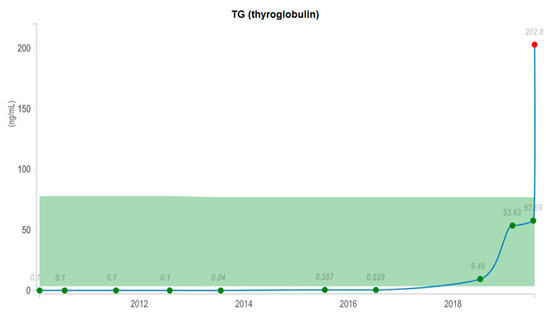 Thyroglobulin (TG) level dynamics (2010–2019). At the ending of 2018 TG level started to rise, in 2019 reaching a maximum level of 202.8 ng/mL.