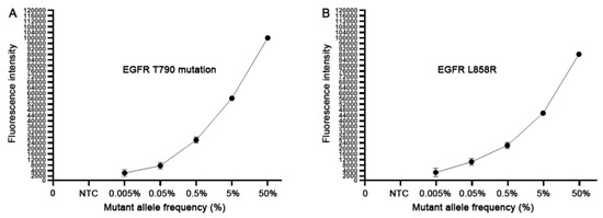 The analytical sensitivity of the CRISPR-Cas12a system. The serially diluted H1975 positive cell line DNA with different mutant allele frequency (%) of 790M (A) and L858R (B) in human normal genomic DNA was tested. Each concentration of the serially diluted positive cell line DNA was tested in triplicates for three times.