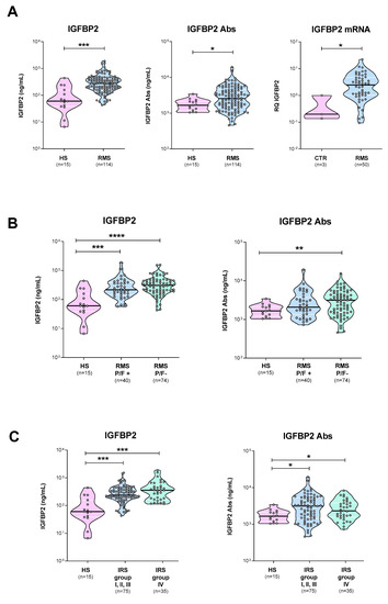 Plasmatic levels of circulating IGFBP2 protein and anti-IGFBP2 antibodies were measured at diagnosis by commercially available and home-made ELISA assays, respectively. We found that plasmatic levels of both IGFBP2 protein and autoantibodies were significantly higher in children with RMS compared to controls (IGFBP2 median: 275.5 vs. 60.1 ng/mL, p < 0.001; IGFBP2 Abs median: 2559 vs. 1663 ng/mL, p = 0.023, respectively), as was IGFBP2 mRNA (p = 0,024) (Figure 1A). However, while IGFBP2 protein levels were statistically significant both in PAX3/7-FOXO1 fusion-positive (p = 0.0001) and –negative (p < 0.0001) plasma samples, anti-IGFBP2 antibodies were only in fusion-negative ones (p = 0.009) (Figure 1B). In addition, plasmatic levels of IGFBP2 and anti-IGFBP2 antibodies were not statistically different comparing patients with localized (IRS I, II, III) vs. metastatic (IRS IV) disease at diagnosis (Figure 1C). Similarly, no other known clinical parameters, including gender, age, tumor size and site were found associated with IGFBP2 and anti-IGFBP2 antibodies levels (Figure S1).