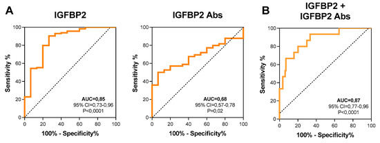 Diagnostic value of IGFBP2 protein and autoantibodies. (A) Receiver operating characteristic (ROC) curves of plasmatic IGFBP2 protein and autoantibodies alone or (B) in combination, to distinguish RMS patients from healthy subjects. AUC: area under the curve; CI: confidence interval.