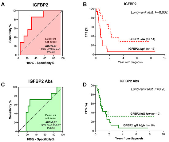Event-free survival (EFS) analysis distinguishing metastatic RMS patients according to plasmatic IGFBP2 and anti-IGFBP2 autoantibodies levels. (A) ROC curve establishing the predictive value that discriminate patients experiencing an event or not based on IGFBP2 protein levels and (B) Kaplan-Meier survival analysis representing EFS of metastatic RMS patients distinguished according to IGFBP2 levels. (C) ROC curves using anti-IGFBP2 autoantibodies levels to discriminate patients as in (A) and (D) Kaplan-Meier curves showing EFS of metastatic RMS patients distinguished according anti-IGFBP2 levels. AUC, area under the curve; CI, confidence interval.