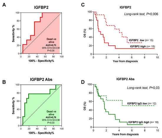 Overall survival (OS) analysis distinguishing metastatic RMS patients according to plasmatic IGFBP2 and anti-IGFBP2 autoantibodies levels. (A) IGFBP2 and (B) anti-IGFBP2 autoantibodies predictive values in metastatic RMS patients who died of disease or not. Kaplan-Meier survival analysis representing overall survival (OS) of metastatic RMS patients distinguished according to (C) IGFBP2 and (D) anti-IGFBP2 levels.