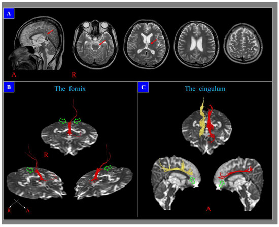 A 28-year-old male who showed loss of consciousness for ten days after a pedestrian–car accident, with diffuse axonal injury lesions (red arrows) in T2-weighted images (A). However, diffusion tensor tractography results reveal neural injuries (discontinuations (green arrows): both fornical crura (B) and anterior cingulums(C)) that are not related to these lesions; these neural injuries are consistent with the subject’s cognitive impairment, which developed after head trauma.