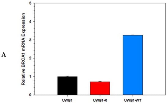 Total RNA was extracted from UWB1.289 cells using the RNeasy Plus Universal Mini Kit (Qiagen). Maxima H Minus FirstStrand cDNA Synthesis Kit (ThermoFisher Scientific, Waltham, MA, USA) was used to prepare cDNA according to manufacturer’s instructions. Real-time PCR was run on each cDNA sample in triplicate per gene using TaqMan Gene Expression Assays (BRCA1: Hs01556193_m1, BRCA2: Hs00609073_m1) and a QuantStudio 7 Flex Real-Time PCR System (ThermoFisher Scientific, Waltham, MA, USA). Relative gene expression was calculated using the DDCT method with TBP (Hs00427621_m1) as the endogenous reference gene [19].