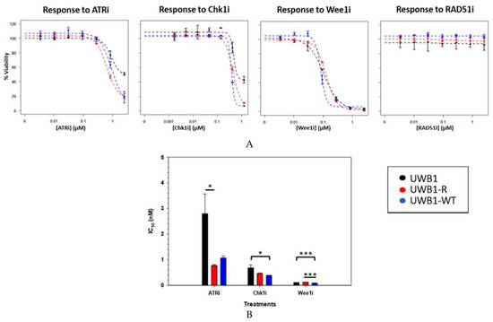 (A) Cell viability assay shown for cells versus screened inhibitors: ATRi, Chk1i, Wee1i and RAD51i. Cells were treated with media containing inhibitors for 144 h at increasing doses and the dose-response plotted for each cell line to estimate the IC50. Experiments were completed in duplicate with standard deviation error bars shown. (B) Estimated IC50 for each cell line. IC50 of ATRi was estimated to be 2.8 ± 0.77 µM, 0.78 ± 0.04 µM and 1.1 ± 0.08 µM for the UWB1, UWB1-R and UWB1-WT cells, respectively. IC50 of UWB1-R cells was significantly lower compared to UWB1 cells (α < 0.05). IC50 for the Chk1i was: 0.69 ± 0.11 µM, 0.47 ± 0.02 µM and 0.39 ± 0.004 µM respectively. UWB1-WT was significantly lower than UWB1 (α < 0.05). IC50 for the Wee1i: 0.11 ± 0.005 µM, 0.13 ± 0.05 µM, and 0.09 ± 0.005 µM for UWB1, UWB1-R and UWB1-WT respectively. UWB1-WT was significantly lower than UWB1 and UWB1-R cells (α < 0.001).