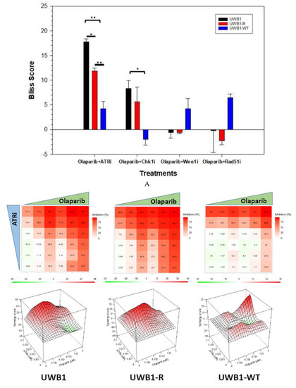 (A) Overall estimated Bliss scores for UWB1, UWB1-R and UWB-WT cells for each drug combination of olaparib with: ATRi (Olap + ATRi), Chk1i (Olap + Chk1i), Wee1i (Olap + Wee1i), RAD51i (Olap + RAD51i). Olap + ATRi resulted in an overall synergy response for all cell lines with UWB1-WT significantly less than UWB1 and UWB1-R. Olap + Chk1i also resulted in an overall synergy response for UWB1 and UWB1-R cells, but antagonism for UWB1-WT cells. Olap + Wee1i and Olap + RAD51i combinations did not result in any significant synergy for the UWB1 and UWB1-R cells, but synergy was observed for the UWB1-WT cells. α < 0.05 = *, α < 0.01 = **, α < 0.001 = ***. Experiments were completed in duplicate with standard deviation error bars shown. (B) 2-D surface response for cell inhibition and 3-D surface Bliss synergy response for Olap + ATRi for UWB1, UWB1-R and UWB-WT cells. (C) 2-D surface response for cell inhibition and 3-D surface Bliss synergy response for Olap + Chk1i for UWB1, UWB1-R and UWB-WT cells.