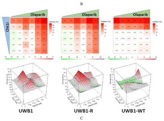 As shown in Figure 3B, drug synergy for Olap + ATRi was demonstrated over a robust concentration range, with olaparib at concentrations ranging from 0.3–1.25 µM and the corresponding ATRi concentrations ranging from 0.8–2.5 µM. Cell inhibition was noted to be up to >90% with these concentrations ranges. Similarly, as shown in Figure 3C, drug synergy for Olap + Chk1i was found over a large concentration with olaparib 0.3–1.25 µM and the corresponding Chk1i 0.05–1.25 µM. The Olap + Chk1i also achieved up to >90% cell inhibition.