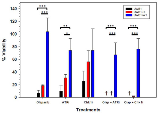 Cell viability after 21 days exposure to olaparib (1 µM), ATRi (0.8 µM), Chk1i (0.5 µM), and combination treatments with olaparib (1 µM) + ATRi (0.8 µM) and olaparib (1 µM) + Chk1i (0.5 µM). Olaparib treatment: UWB1 and UW1-R cells were significantly more sensitive to olaparib and ATRi (p = 0.002). ATR treatment: Cell viability for UWB1-R (p = 0.002) and UWB1-WT cells (p = 0.02) were significantly less compared to UWB1 cells. Chk1 treatment: Increasing cell viability trend is noted for UWB1-R compared to UWB1 followed by UWB1-WT. The magnitude of the differences was not statistically significant. Olap + ATRi treatment: Cell viability was significantly less in UWB1 (0%) and UWB1-R cells (0%) compared to UWB1-WT (67 ± 19%) (p = 0.0005). Olap + Chk1 treatment: Cell viability for UWB1 (0%) and UWB1-R (1.4 ± 1%) was was significantly less compared to UWB1-WT (76.4 ± 16%) (p = <0.0001). Experiments were completed in triplicate with standard deviation error bars shown. α < 0.05 = *, α < 0.01 = **, α < 0.001 = ***.