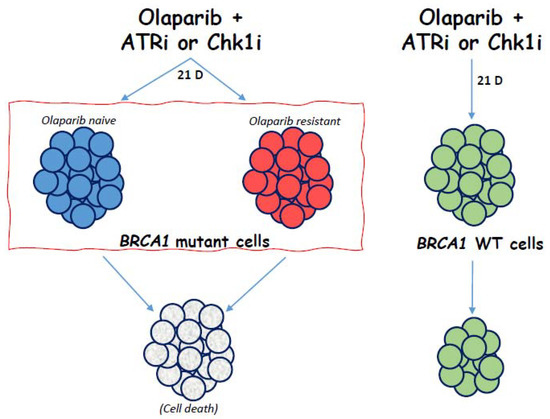 Treatment of BRCA1 mutant cells, regardless of olaparib-resistant status, results in cell population death with Olaparib + ATRi or Olaparib + Chk1i. BRCA1 wild-type cell population is decreased only slightly with the same treatment.