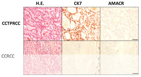 - Adam, J.; Couturier, J.; Molinie, V.; Vieillefond, A.; Sibony, M. Clear-cell papillary renal cell carcinoma: 24 cases of a distinct low-grade renal tumour and a comparative genomic hybridization array study of seven cases. Histopathology 2011, 58, 1064–1071. [Google Scholar] [CrossRef]