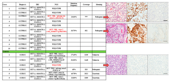 - Fiorentino, M.; Gruppioni, E.; Massari, F.; Giunchi, F.; Altimari, A.; Ciccarese, C.; Bimbatti, D.; Scarpa, A.; Iacovelli, R.; Porta, C.; et al. Wide spetcrum mutational analysis of metastatic renal cell cancer: A retrospective next generation sequencing approach. Oncotarget 2017, 8, 7328–7335. [Google Scholar] [CrossRef]