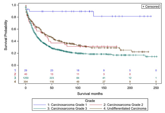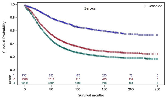 Well differentiated (grade 1: blue curve) serous EOC had much better DSS than moderately differentiated (grade 2: red curve) or poorly differentiated (grade 3: green curve) serous EOC (Figure 1). The separation in DSS between grade 1 and grade 2–3 serous EOC supports a two tier classification [24,25,26] of the serous histo-types (low grade = grade 1 vs. high grade = grade 2–3). In contrast, the DSS of women with moderately differentiated grade 2 endometrioid carcinomas (Figure 2A: red curve) was closer to DSS of women with well differentiated grade 1 endometrioid carcinomas (Figure 2A: blue curve). Importantly, DSS of poorly differentiated (grade 3) endometrioid carcinoma was superior to DSS for poorly differentiated (grade 3) serous EOC (44% vs. 19% at 200–250 months). DSS of moderately differentiated (grade 2) mucinous ovarian carcinoma (Figure 2B: red curve) was intermediate between well-differentiated (grade 1, blue curve) and poorly differentiated (grade 3) mucinous carcinoma (green curve) with DSS of poorly differentiated (grade 3) mucinous carcinoma better than poorly differentiated (grade 3) serous EOC (35% vs. 19% at 200–250 months), and less than DSS for poorly differentiated (grade 3) endometrioid carcinoma (35% vs. 44% at 200–250 months). DSS of women with moderately differentiated (grade 2) clear cell ovarian carcinomas (Figure 2C: red curve) was very similar to DSS of well-differentiated (grade 1) clear cell carcinomas (blue curve). Poorly differentiated (grade 3) clear cell carcinomas (green curve) demonstrated DSS better than poorly differentiated (grade 3) endometrioid carcinomas (56% vs. 44%) and better DSS than poorly differentiated (grade 3) serous EOC (55% vs. 19% at 200–250 months) or poorly differentiated mucinous ovarian carcinoma (55% vs. 35% at 200–250 months). DSS of women with moderately differentiated (grade 2) carcinosarcoma (Figure 3: red curve) was intermediate between well-differentiated (grade 1, blue curve) and poorly differentiated (grade 3) carcinosarcoma (green curve) with DSS of poorly differentiated grade 3 carcinosarcoma similar to poorly differentiated (grade 3) serous EOS (18.9% vs. 19% at 200–250 months), but less than for poorly differentiated (grade 3) endometrioid carcinoma (18.9% vs. 44% at 200–250 months), poorly differentiated (grade 3) mucinous carcinoma (18.9% vs. 35% at 200–250 months) or poorly differentiated (grade 3) clear cell carcinoma (18.9% vs. 56% at 200–250 months). DSS of women with undifferentiated carcinoma (Figure 3 brown curve) was similar to undifferentiated (grade 3) carcinosarcoma (26% vs. 18.9% at 200–250 months) and slightly greater than undifferentiated (grade 3) serous EOC (26% vs. 19% at 200–250 months).