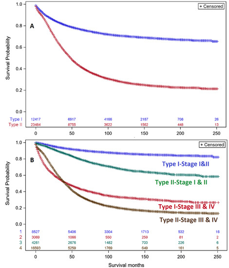 Kaplan–Meier survival of women with Type I & II EOC. (A). DSS of women with Type I EOC (blue curve, n= 12,417; 50, 100 & 200-month survival is 78.5%, 71.7%, 66.6%). DSS of women with Type II EOC (red curve, n= 23,484; 50, 100, & 200-month survival is 50.6%, 31.7%, 22.9%). p-value obtained by the log rank test. The number of women remaining at different survival points is shown for Type I (blue) and Type II (red) epithelial ovarian cancers. (Type I vs. Type II: p < 0.001). The number of women remaining at different survival points is color-coded for each of the four categories along the x-axis. Vertical lines identify censored data points. (B). DSS of women with Type I & II EOC according to stage. Early stage (I & II) Type I EOC (blue curve, n= 8,527; 50, 100 & 200-month survival is 91.9%, 87.7%, 84.9%). Early stage (I & II) Type II EOC (green curve, n= 4,261; 50, 100 & 200-month survival is 83.9%, 71.0%, 60.3%). Late stage (III & IV) Type I EOC (red curve, n= 3,069; 50, 100 & 200-month survival is 47.9%, 35.3%, 28.1%). Late stage (III & IV) Type II EOC (brown curve, n= 16,593; 50, 100 & 200-month survival is 44.2%, 23.4%, 15.2%) (Type I vs. Type II: p < 0.001). p-value obtained by the log rank test. The number of women remaining at different survival points is color-coded for each of the four categories along the x-axis. Vertical lines identify censored data points.