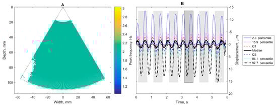 The dominant frequency (here 2 Hz), determined as the most frequent value of peak frequency from points with spectral peak frequency within 0.75–5 Hz, is mapped in Figure 4A. The colored map provides an overview of points of only 2 Hz-related displacements. The uncolored locations in Figure 4A (mostly at the left corner) are presumably corrupted by noise. For further confidence evaluation by Pearson correlation, six 600 ms epochs were selected as similar waveforms in the average signal of points with dominant frequency (Figure 4B). The range of displacements detected in the motion field is presented with quartiles and percentiles in Figure 4B too.