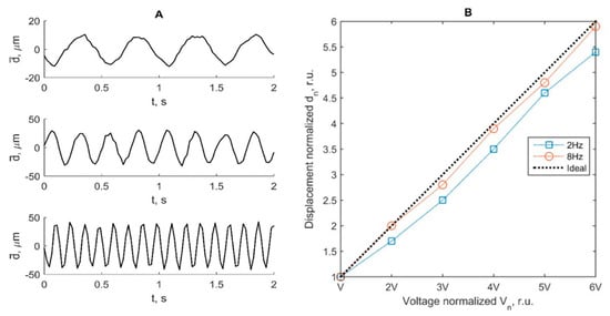 (A) The detected displacement signals for the 2 Hz (upper), 4 Hz (middle), 8 Hz (lowest) solenoid excitation frequencies; (B) detected displacements resulting from proportional changes in excitation amplitude of the solenoid. The dashed line represents the ideal theoretical case of detection. Excitation peak-to-peak voltages were 0.5 V, 1 V, 1.5 V, 2 V, 2.5 V, and 3 V at frequencies of 2 Hz and 8 Hz.